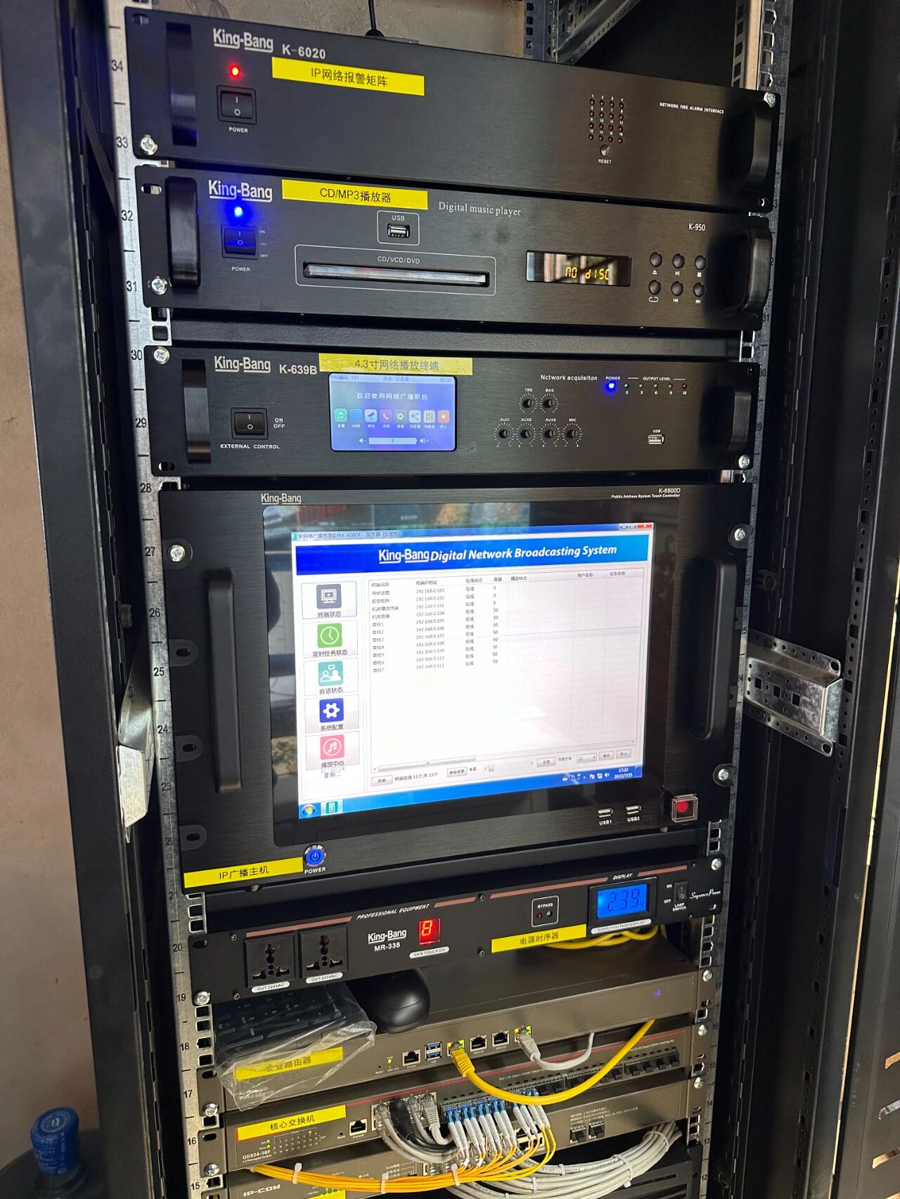 根據(jù)用戶需求,配置了15英寸IP網(wǎng)絡(luò)觸屏廣播服務(wù)器(支持多種音樂播放模式,如USB熱插播、硬盤)、4.3英寸IP網(wǎng)絡(luò)機(jī)架編碼器(觸屏版)內(nèi)置自定義8個快捷按鍵,每個按鍵可定義中文名字為廣播喊話、雙向?qū)χv、及文件廣播等應(yīng)用,DVD/MP3播放器(微電腦控制,輕觸式按鍵操作),16路網(wǎng)絡(luò)報(bào)警矩陣(系統(tǒng)可支持多臺IP網(wǎng)絡(luò)消防采集器同時接入,用戶可根據(jù)自己的需求任意擴(kuò)展),8路20A多功能時序器(芯片控制,使電路更加穩(wěn)定可靠),大功率室外防水音柱揚(yáng)聲器等廣播設(shè)備(適用于大型廣場、操場、公園、體育館、高速公路、高鐵、地鐵等場所進(jìn)行遠(yuǎn)程擴(kuò)音,可用來應(yīng)急廣播和播放背景音樂)。讓整套系統(tǒng)使用效果更佳,使用更加方便。