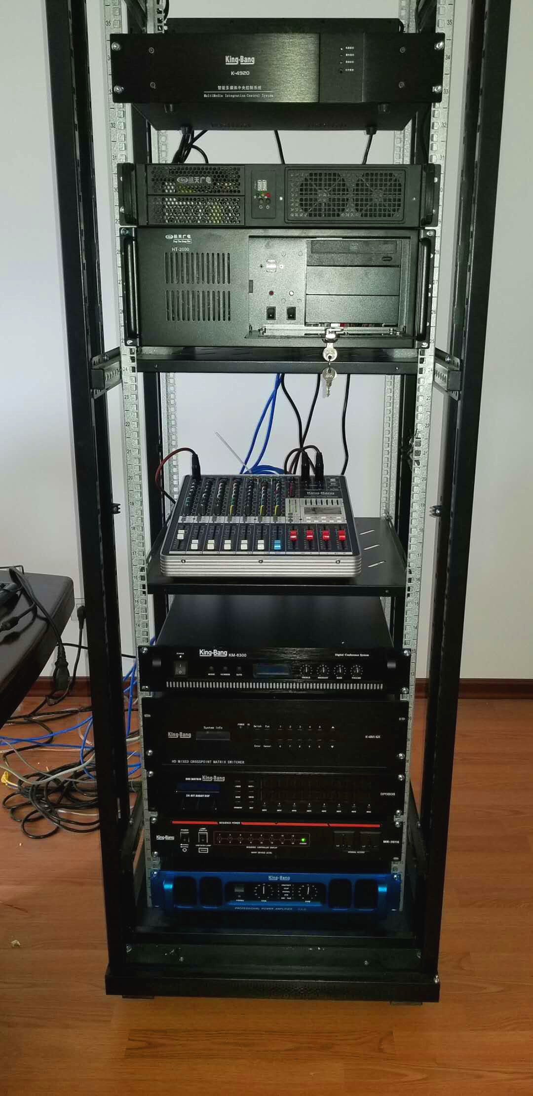 中央控制系統:選用京邦電子(KING-BANG)可編程網絡中控主機K-4920作為整個會議室的控制核心,對會議室內各個子系統進行控制。內嵌式高效處理器,集成化處理芯片,能高速運行復雜的邏輯命令。保障了整個執行指揮中心所有設備的都能流暢、穩定的運行??蓪φ麄€系統編程控制,用戶可根據自己的使用習慣對控制界面進行的設計,控制方式更友好、更具人性化。